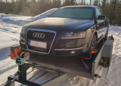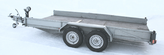 Käsikäyttöinen vinssi (maks. 1600 kg) ja lankuista (20 cm korkeat) väsätyt ajosillat. Kuvasta poiketen myös 20 cm korkeat etu- ja takalaidat. Mukaan saat tarvittaessa 4 kpl järeitä kuormaliinoja, aisalukon ja 7-13 napaisen adapterin.